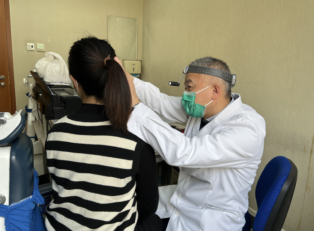 北京大学人民医院耳鼻喉科主任余力生为门诊患者进行耳科检查。新华社记者顾天成 摄