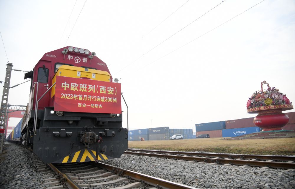 满载日用百货的X8151次中欧班列准备从西安国际港站开往白俄罗斯首都明斯克。