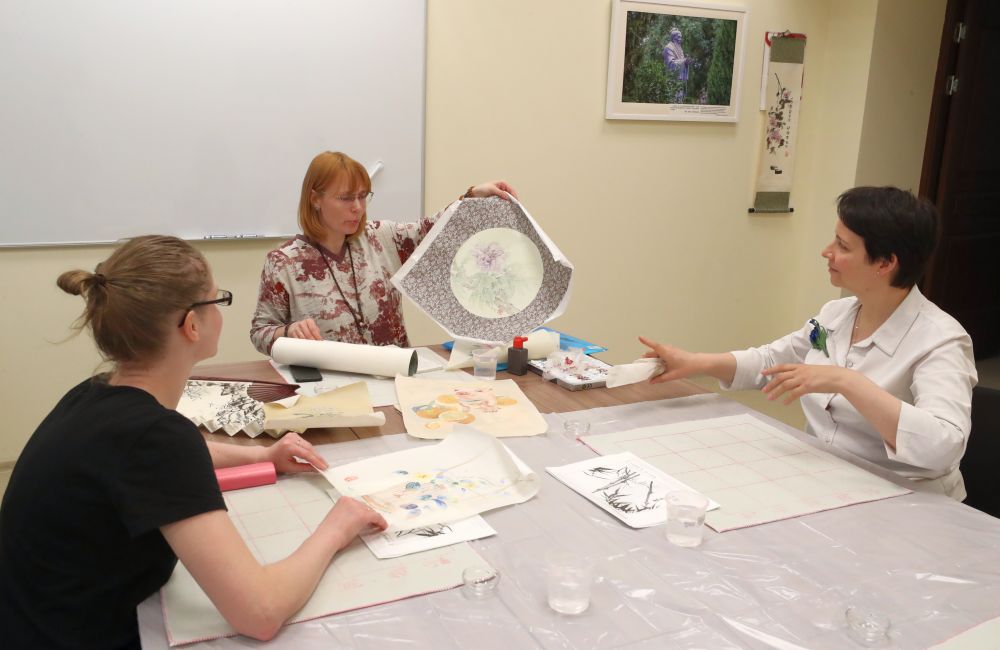 白俄罗斯艺术爱好者马尔季涅夫斯卡娅(中)在明斯克的白俄罗斯国立大学孔子学院教授中国绘画。