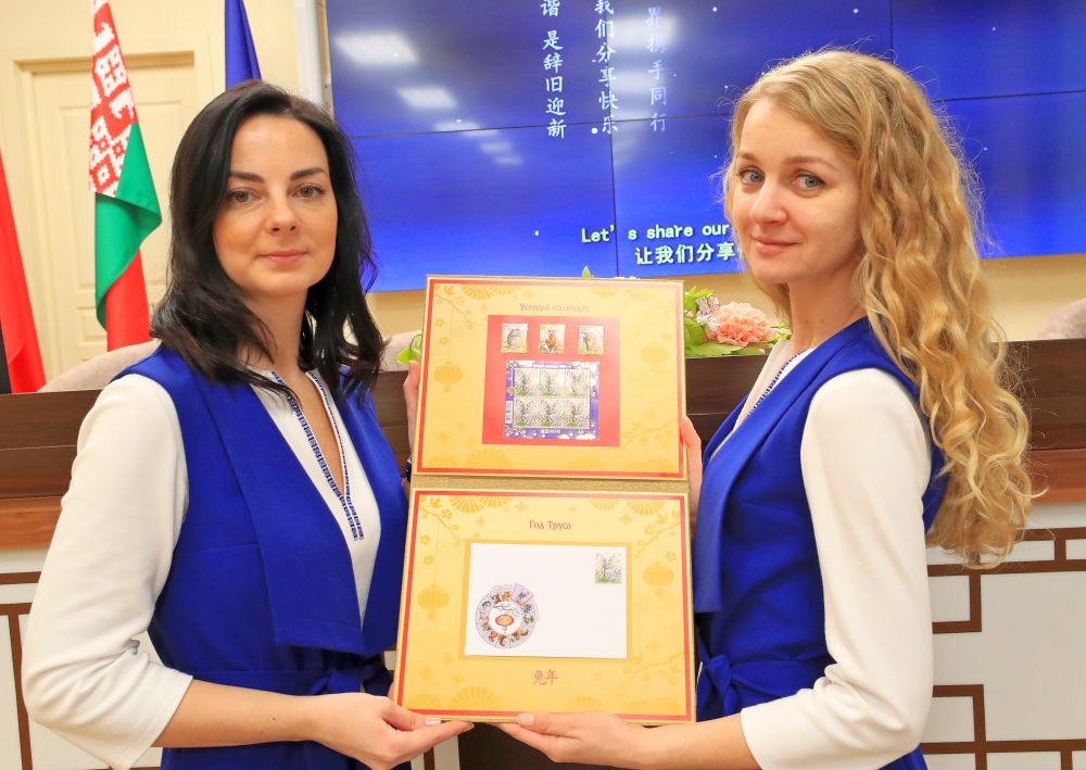 白俄罗斯国立大学孔子学院在明斯克举办《东方历法:兔年》邮票和首日封发行仪式。工作人员展示白俄罗斯通信与信息化部发行的中国兔年邮票和首日封。