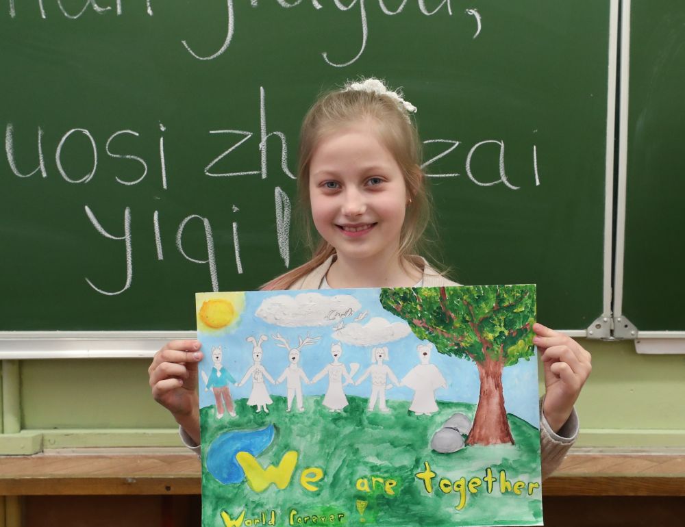 在白俄罗斯首都明斯克,一名小学生展示自己支持中国抗击新冠肺炎疫情的绘画作品。
