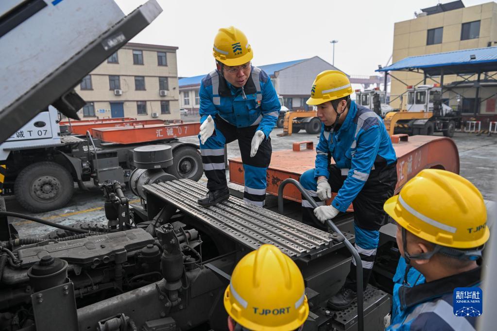 在天津港第一港埠有限公司,成卫东在一辆正在维修的拖头上实地教学(2月17日摄)。