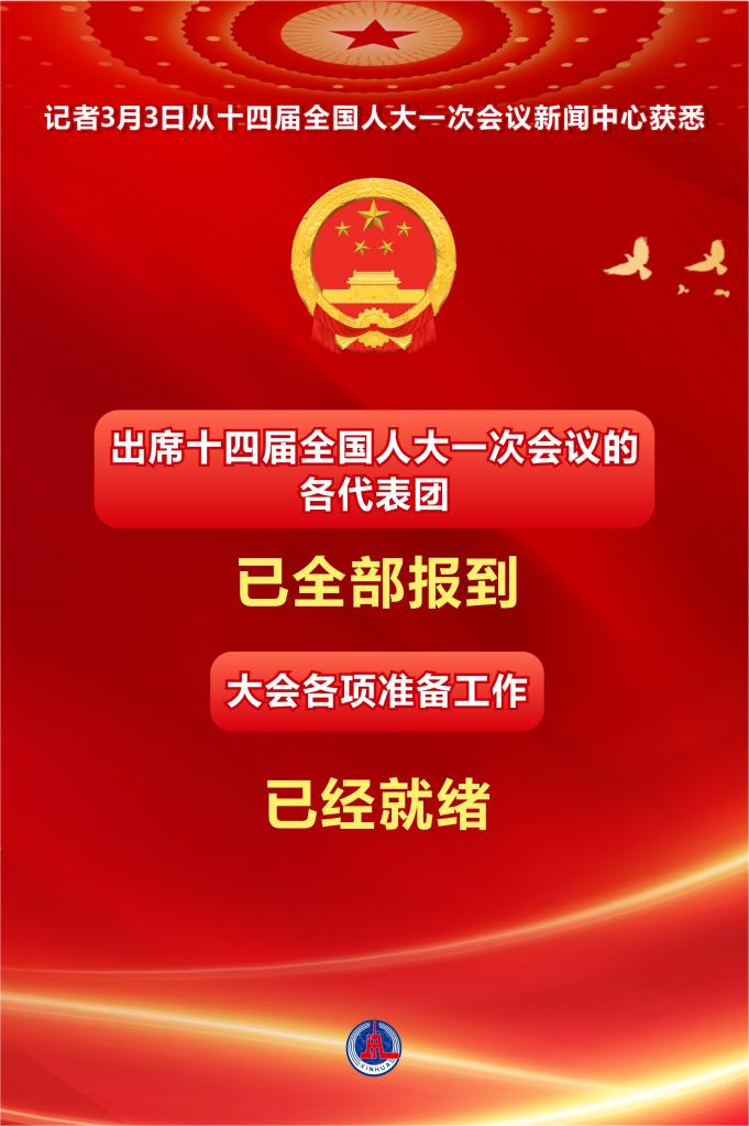 新华社北京3月3日电 记者3日从十四届全国人大一次会议新闻中心获悉,出席此次会议的各代表团已全部报到,大会各项准备工作已经就绪。