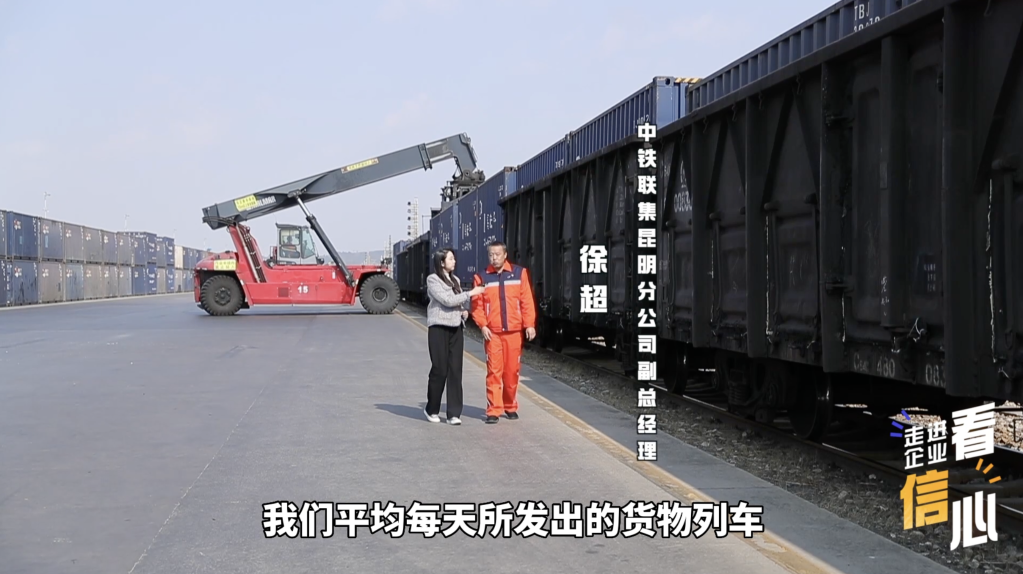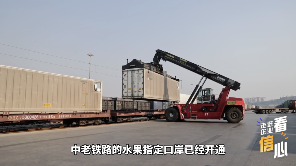 在位于云南昆明市郊的中铁联集昆明中心站货场上,柜式集装箱堆放得整整齐齐,工作人员驾驶着装卸设备把柜式集装箱装上列车。中老铁路国际货物列车每天从这里出发,将出口的电子产品、蔬菜、鲜花等运往老挝,同时运来南亚东南亚国家的香蕉、榴莲、龙眼等水果。