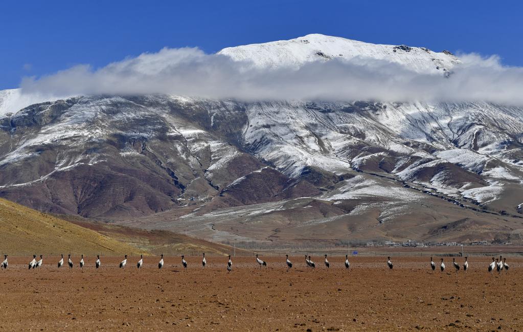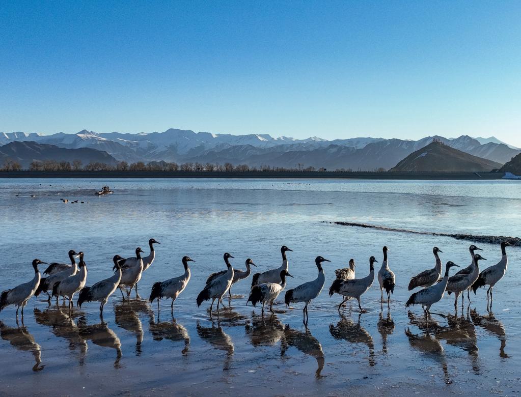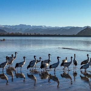 黑颈鹤是国家一级保护动物,主要栖息在海拔2500米至5000米的高原、草甸、沼泽地带。拉萨北部的林周县平均海拔约4200米,是黑颈鹤的主要越冬地之一。