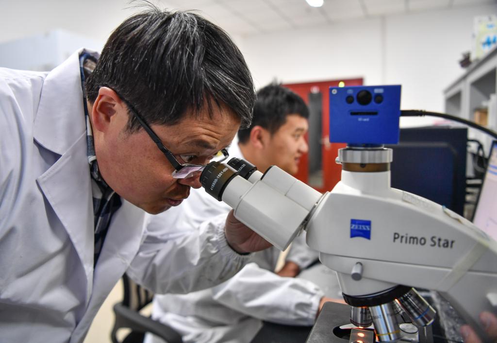 在西藏高原生物研究所,杨乐在实验室中观察动物标本(3月2日摄)。新华社记者 晋美多吉 摄