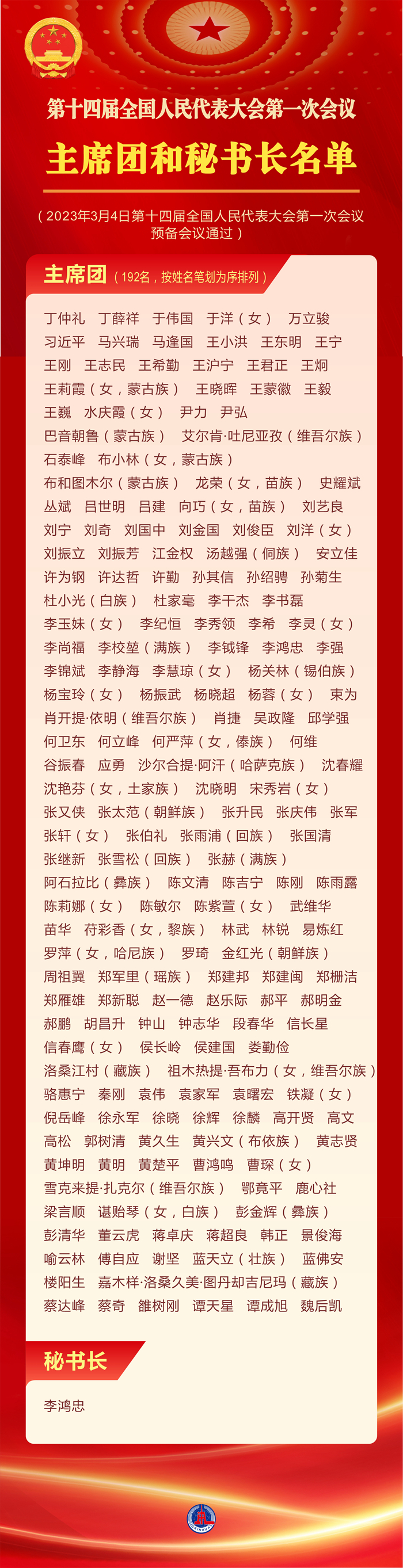 第十四届全国人民代表大会第一次会议主席团和秘书长名单