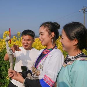 3月4日,唐胜忠(左一)在贵州省榕江县车江坝区油菜花园指导新主播直播。新华社发(王炳真 摄)