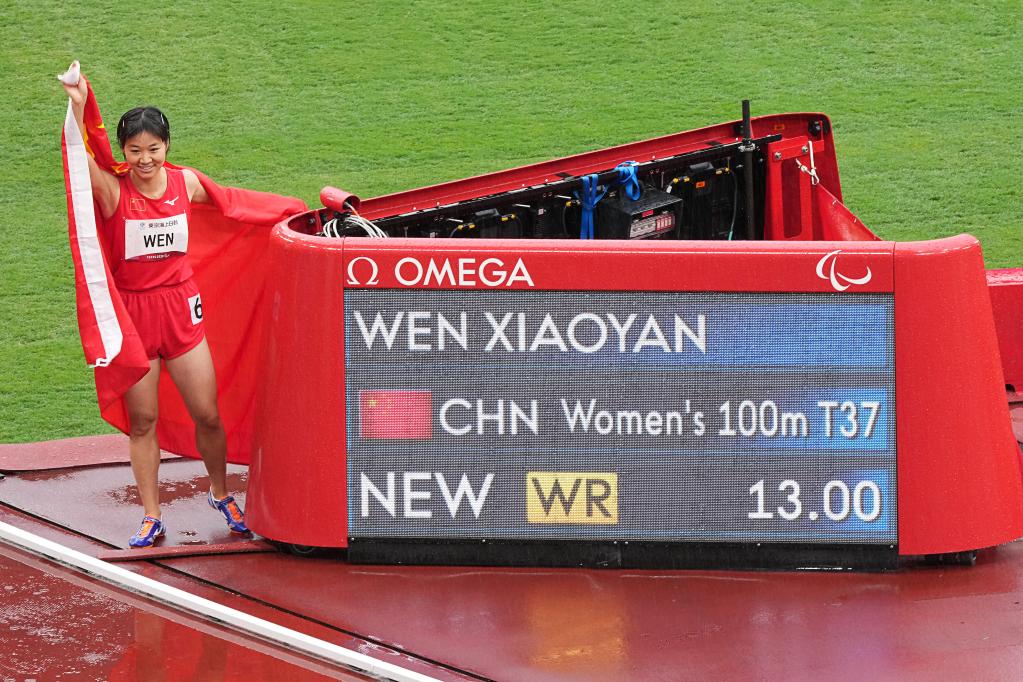 2021年9月2日,在东京残奥会田径女子100米T37级决赛中,中国选手文晓燕以13秒00的成绩打破世界纪录获得金牌。新华社记者熊琦摄
