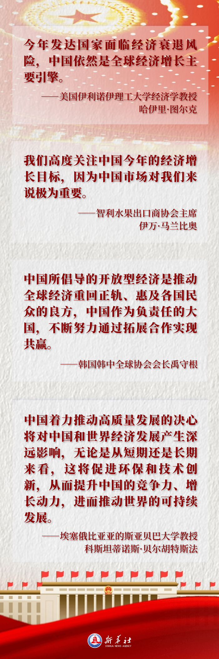 从国内生产总值增长目标,到更大力度吸引和利用外资宣示,从加快建设现代化产业体系,到推动发展方式绿色转型,在中国全面贯彻党的二十大精神的开局之年,国际社会从两会读出新征程上中国高质量发展的举措与步伐,读出中国发展传递给全球的信心、暖意和动力。