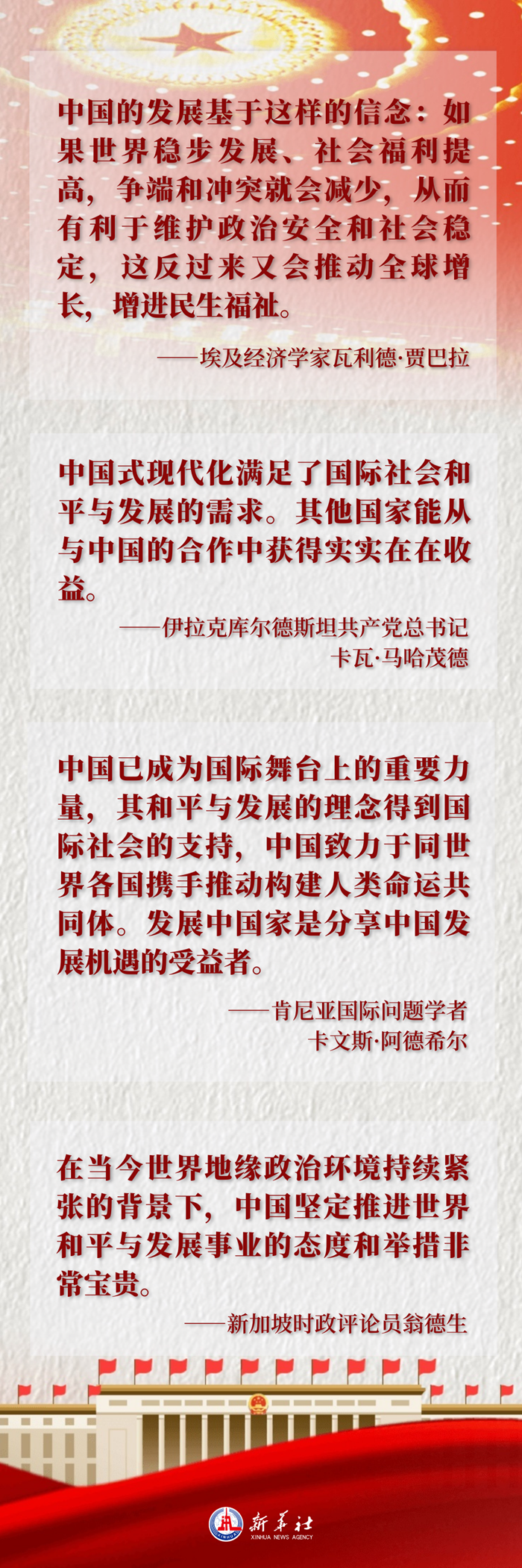 伊朗伊斯兰共和国通讯社资深编辑、中国问题专家穆罕默德·礼萨·马纳菲说,中国坚持和平、平等、友好的外交政策,体现出“让我们共同发展”的价值取向。这样的主张和政策将让我们这个美丽的星球更加和平、安宁和繁荣。(综合新华社驻外记者报道,执笔记者:谢琳、倪红梅、刘品然、王晓梅、齐紫剑)