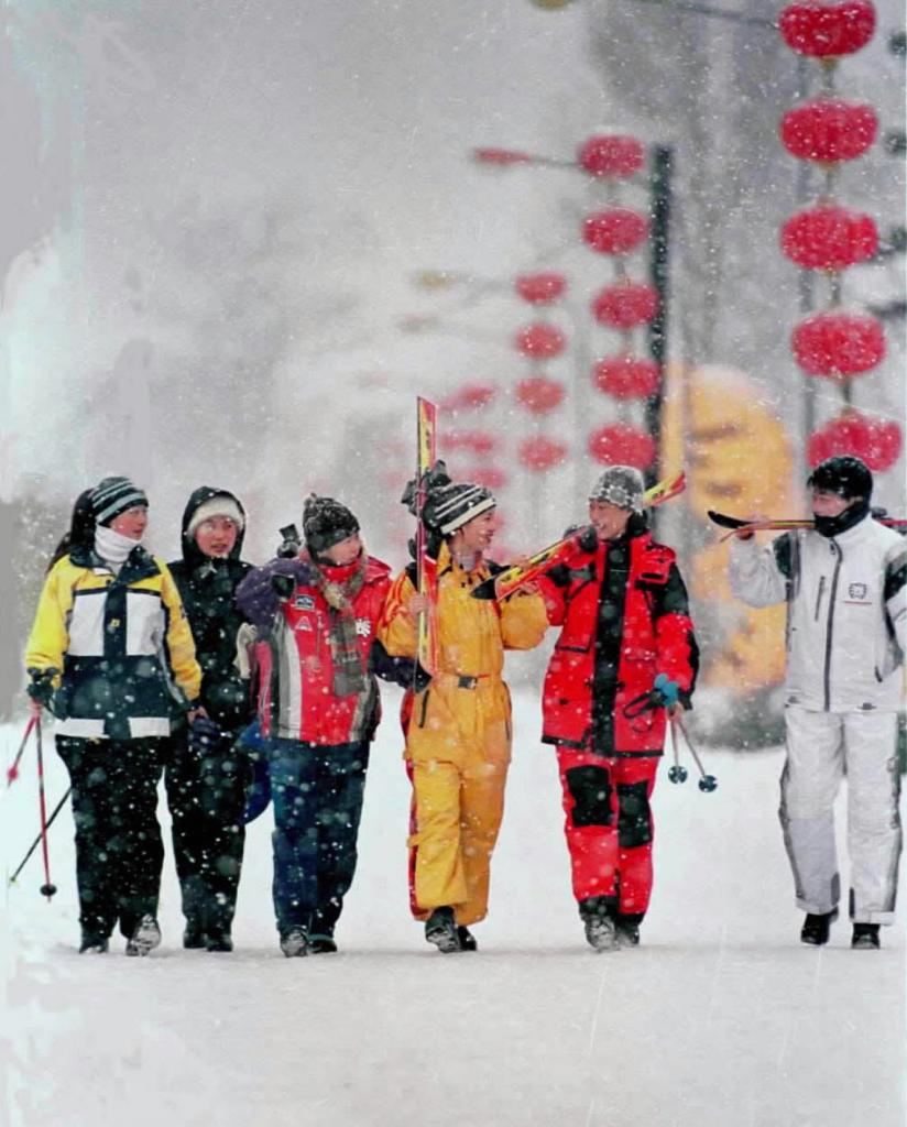 2000年12月2日,第三届中国·黑龙江国际滑雪节暨第17届中国·哈尔滨国际冰雪节滑雪首游仪式在黑龙江省亚布力滑雪中心举行。图为参加滑雪节开幕式系列活动的游客走向雪场。新华社记者周确摄