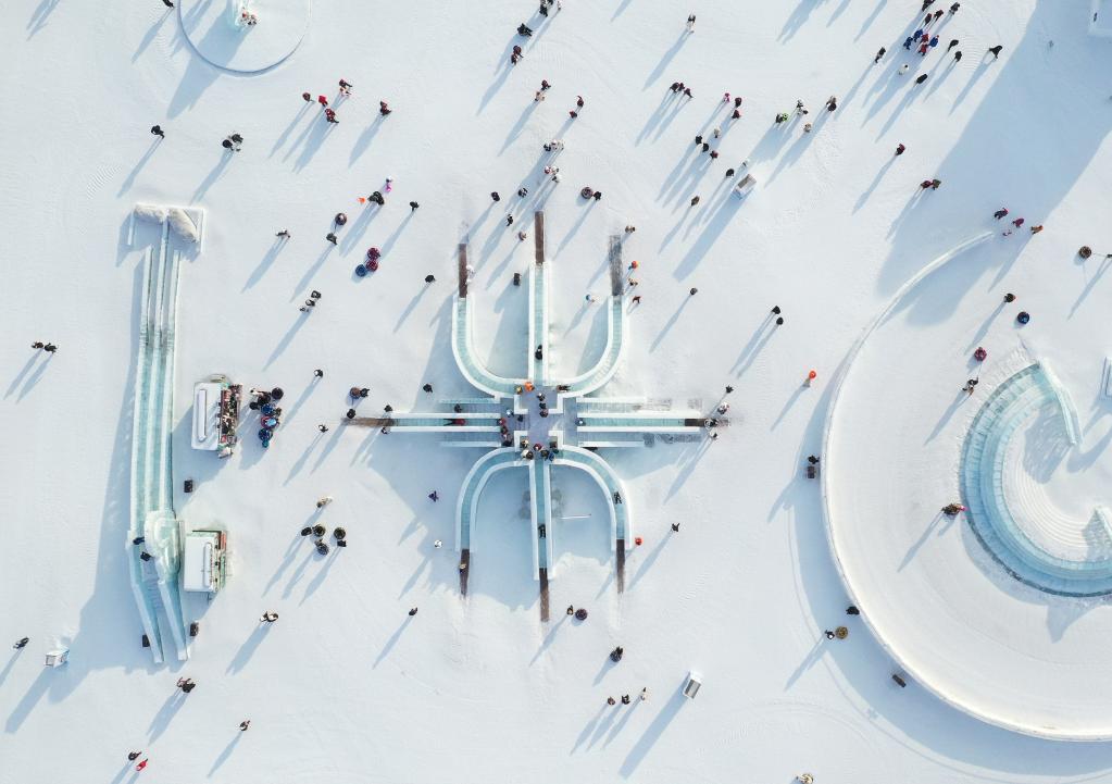 2月9日,人们在哈尔滨冰雪大世界游园(无人机照片)。新华社记者李贺摄