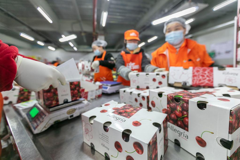 工作人员在综合加工包装中心包装来自智利的车厘子。新华社记者 王翔 摄