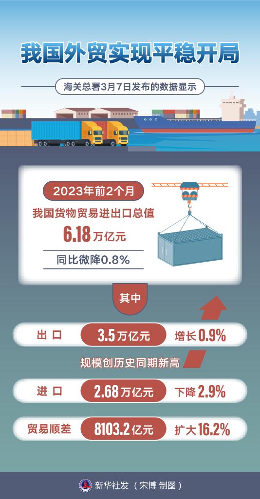 新华社北京3月7日电(记者邹多为、魏一骏)海关总署7日发布的数据显示,今年前2个月,我国货物贸易进出口总值6.18万亿元,同比微降0.8%。其中,出口3.5万亿元,增长0.9%,规模创历史同期新高;进口2.68万亿元,下降2.9%;贸易顺差8103.2亿元,扩大16.2%。