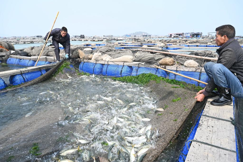 3月2日,渔民在东山县铜陵镇丰汇水产巴浪鱼优新品种推广示范基地捕捞巴浪鱼。新华社记者林善传 摄