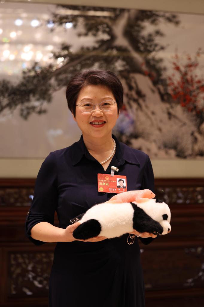 侯蓉代表展示熊猫新生幼崽的仿真模型和憨态可掬的熊猫玩偶。新华社记者任沁沁 摄