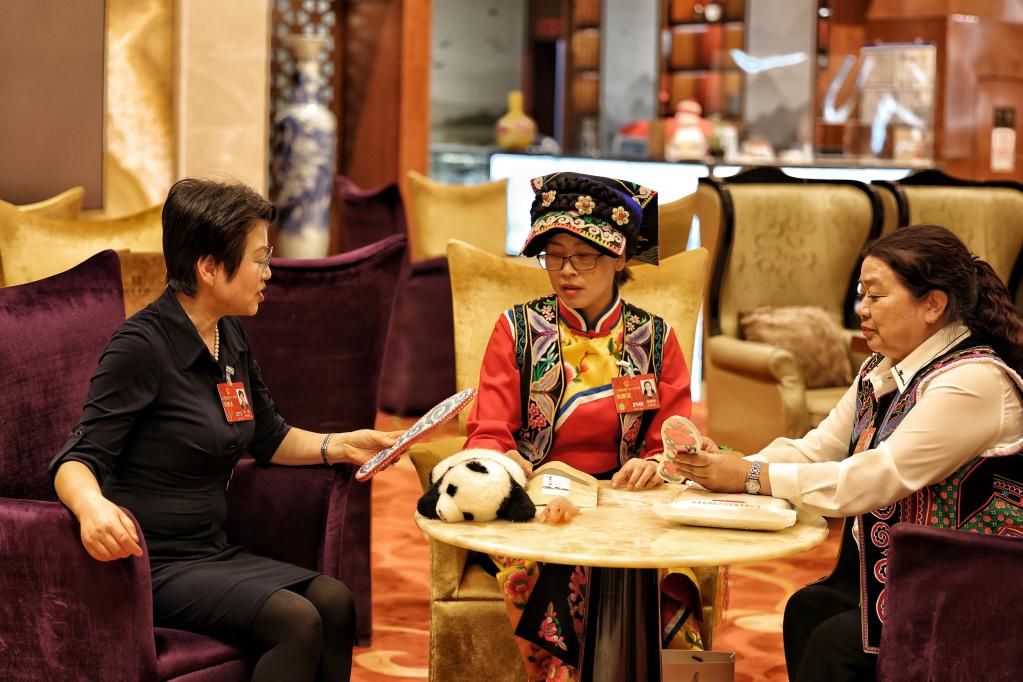 三位女代表在分组会间隙交流家乡发展心得。新华社记者任沁沁 摄