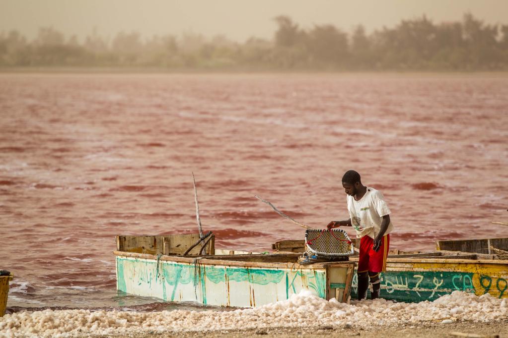 图为2015年3月29日,在塞内加尔玫瑰湖,当地居民在湖边收盐。(新华社记者李京摄)