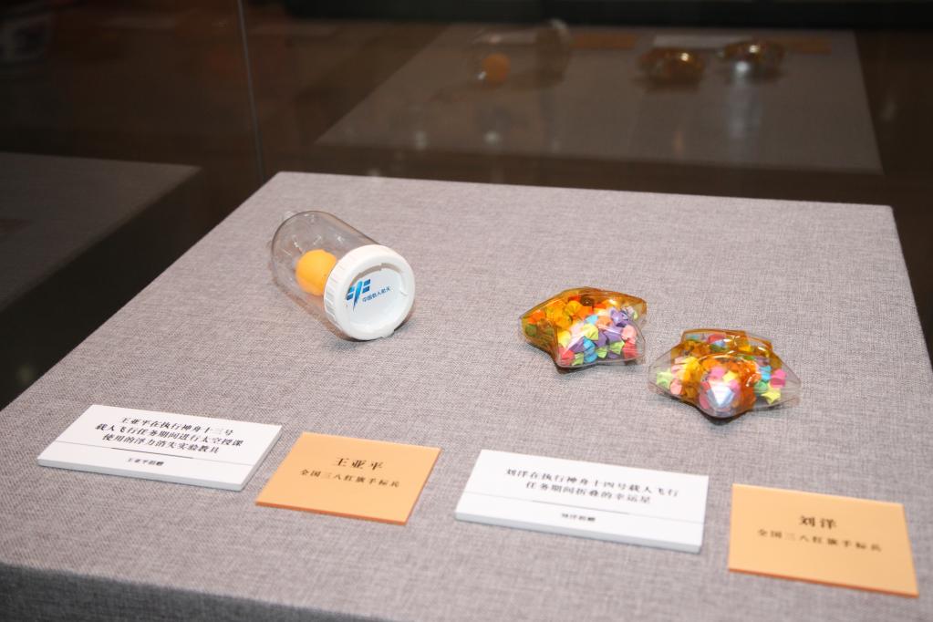 王亚平太空授课的实验教具和刘洋手折的幸运星。(图片由中国妇女儿童博物馆提供)