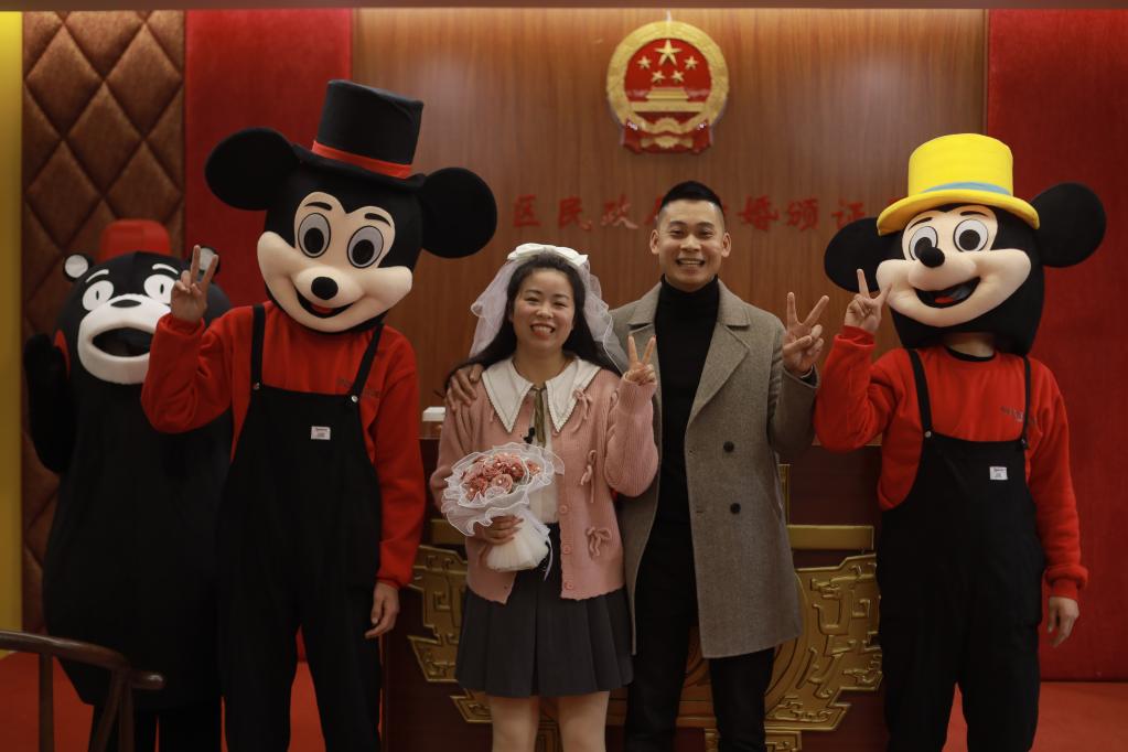 2月14日,吴朴慧和李有霖在重庆市璧山区民政局婚姻登记处领证合影。(受访者供图)