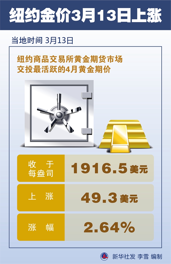 新华社芝加哥3月13日电(记者徐静)纽约商品交易所黄金期货市场交投最活跃的4月黄金期价13日比前一交易日上涨49.3美元,收于每盎司1916.5美元,涨幅为2.64%。
