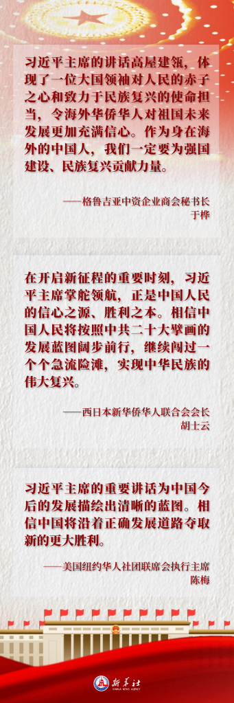 坚守人民立场、坚定历史自信、彰显使命担当、指引前进方向,习近平主席重要讲话让身在海外的华侨华人信心倍增。他们纷纷表示,强国建设、民族复兴的宏伟目标催人奋进,海外中华儿女要凝聚智慧和力量,充分发挥身在海外的优势,做好中国与世界各国之间的桥梁纽带,为书写全面建设社会主义现代化国家、全面推进中华民族伟大复兴的绚丽篇章添砖加瓦、增光添彩。
