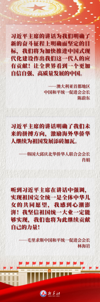 澳大利亚首都地区中国和平统一促进会会长陈蔚东说:“习近平主席的讲话为我们明确了新的奋斗征程上明确而坚定的目标,我们将为加快推进中国式现代化建设作出我们这一代人的应有贡献!让全世界看到一个更加自信自强、高质量发展的中国。”