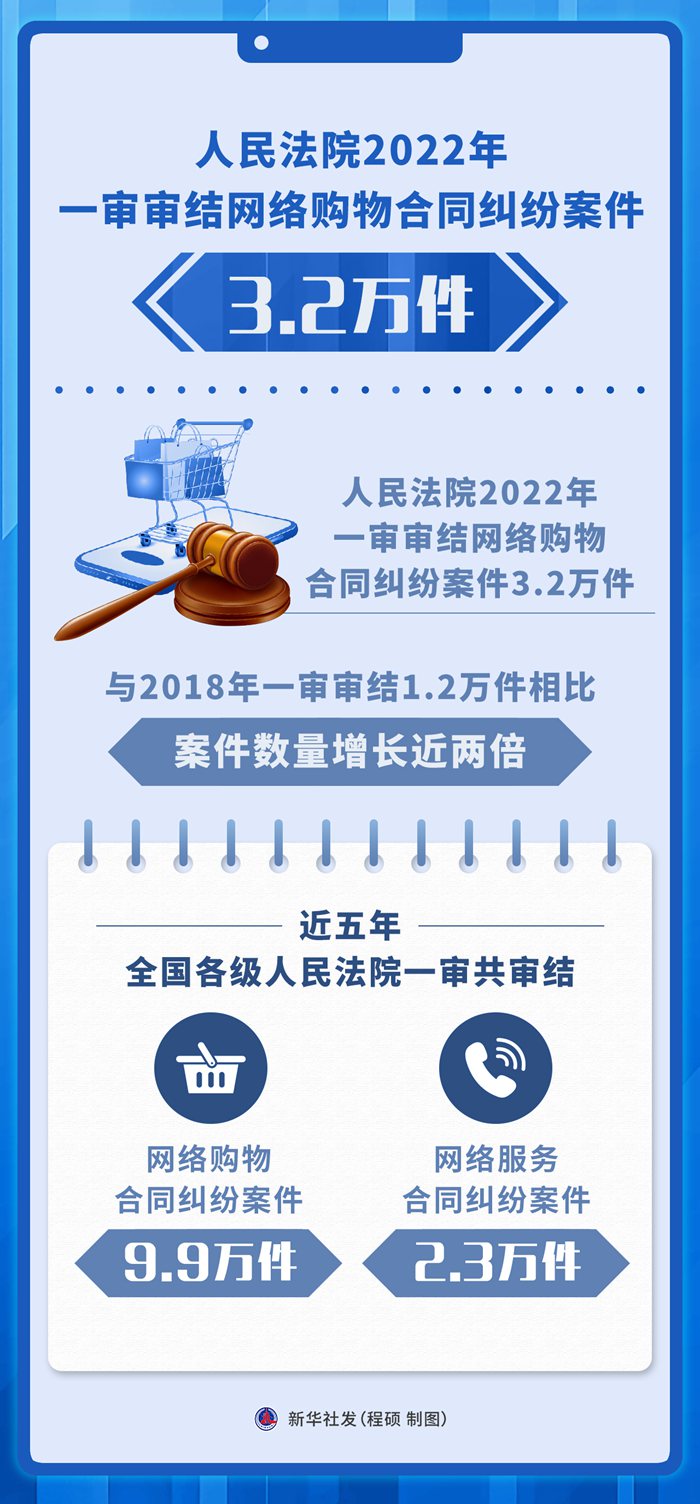 新华社北京3月15日电(记者齐琪、罗沙)人民法院2022年一审审结网络购物合同纠纷案件3.2万件,与2018年一审审结1.2万件相比,案件数量增长近两倍。