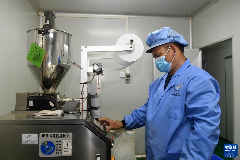 3月16日,在广西金秀瑶族自治县长垌乡平道村一家瑶医药生产企业,员工在生产作业中。