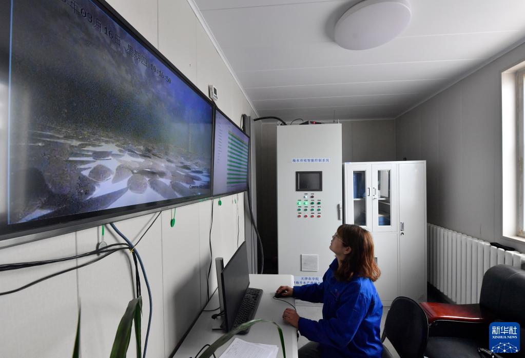 3月16日,在位于天津市滨海新区现代农业产业园的天津海升水产养殖有限公司,工作人员在对育苗车间环境信息进行监控。