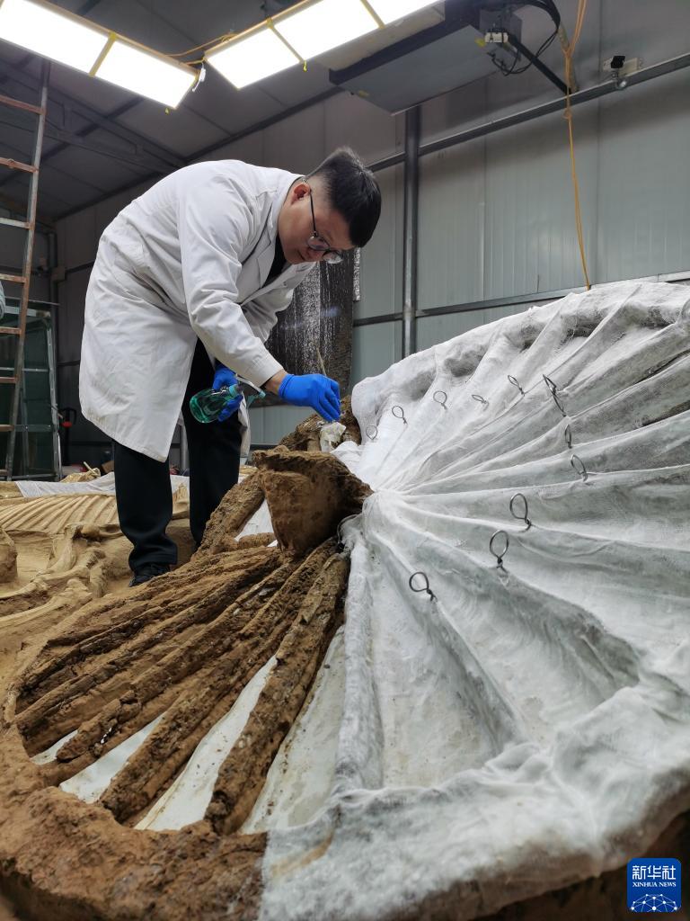 3月16日,在河北行唐故郡遗址考古实验室,工作人员在对二号车马坑的3号车进行清理。
