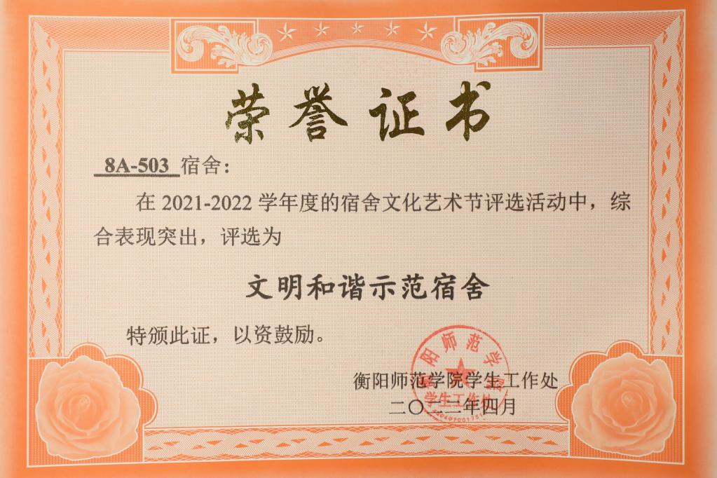 这是503寝室获评“文明和谐示范宿舍”的荣誉证书。(衡阳师范学院供图)