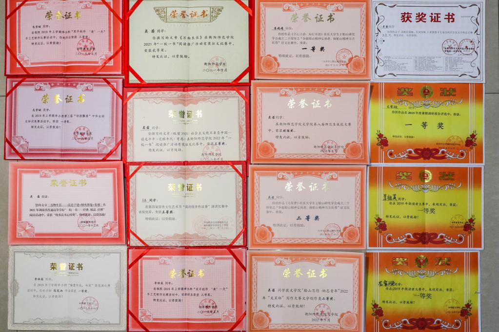 这是503寝室4名同学收获的部分荣誉证书和奖状。(衡阳师范学院供图)