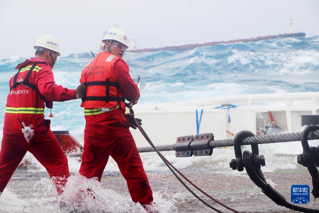 “南海救115”抵达受困货船附近,水手长卢大明(右)带领水手们施救(3月4日摄)。新华社发(交通运输部南海救助局供图)