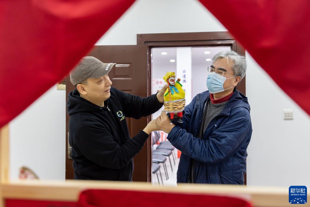 3月17日,上海市黄浦区非物质文化遗产项目“海派木偶戏”代表性传承人项春雷(左)指导居民操作木偶。