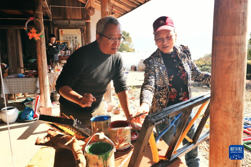 来自台湾的“艺术乡建”专家吴立行(左)在浙江宁海骆家坑村指导村民打造骆家小院(资料照片,2020年11月11日摄)。新华社发