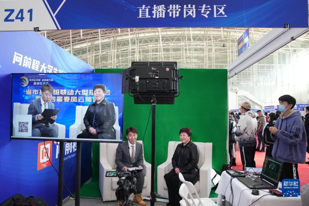 3月18日,在招聘会的直播带岗专区,工作人员在进行带岗直播。新华社记者 王建威 摄