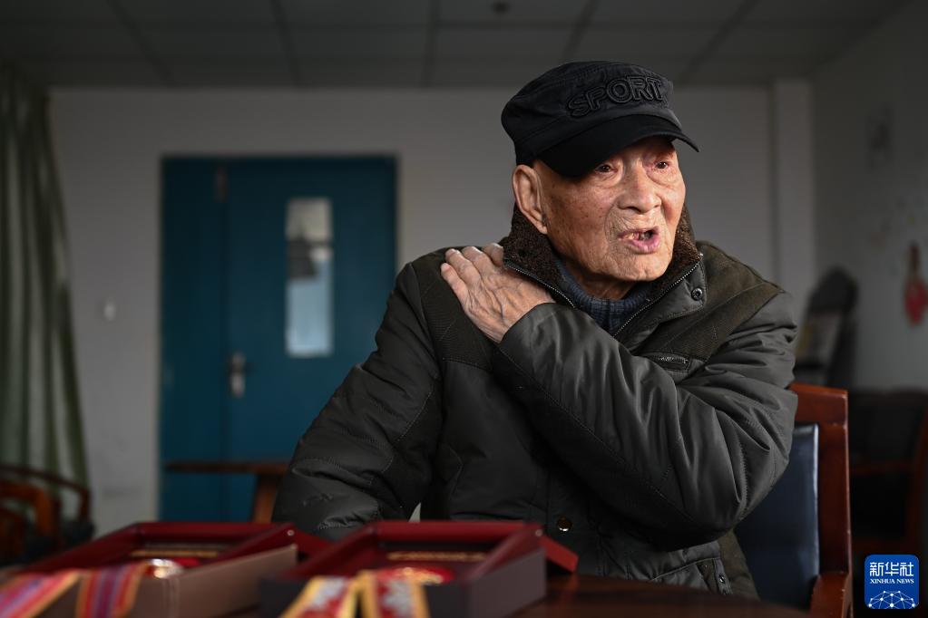 罗锦文老人在浙江省平湖市一家老年康复护理院接受记者采访,摸着右侧肩膀里子弹的位置(3月2日摄)。新华社记者 黄宗治 摄