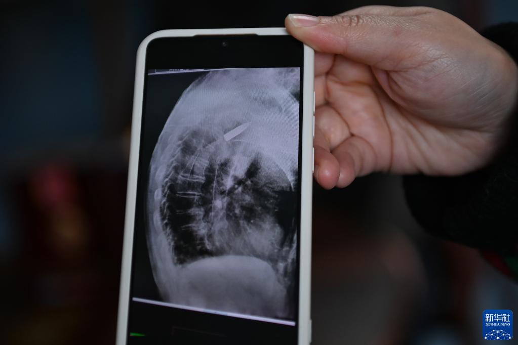 医院的放射线视觉指引图像显示,罗锦文老人右侧肩膀里有一颗长约3.5厘米的子弹(3月2日摄)。新华社记者 黄宗治 摄