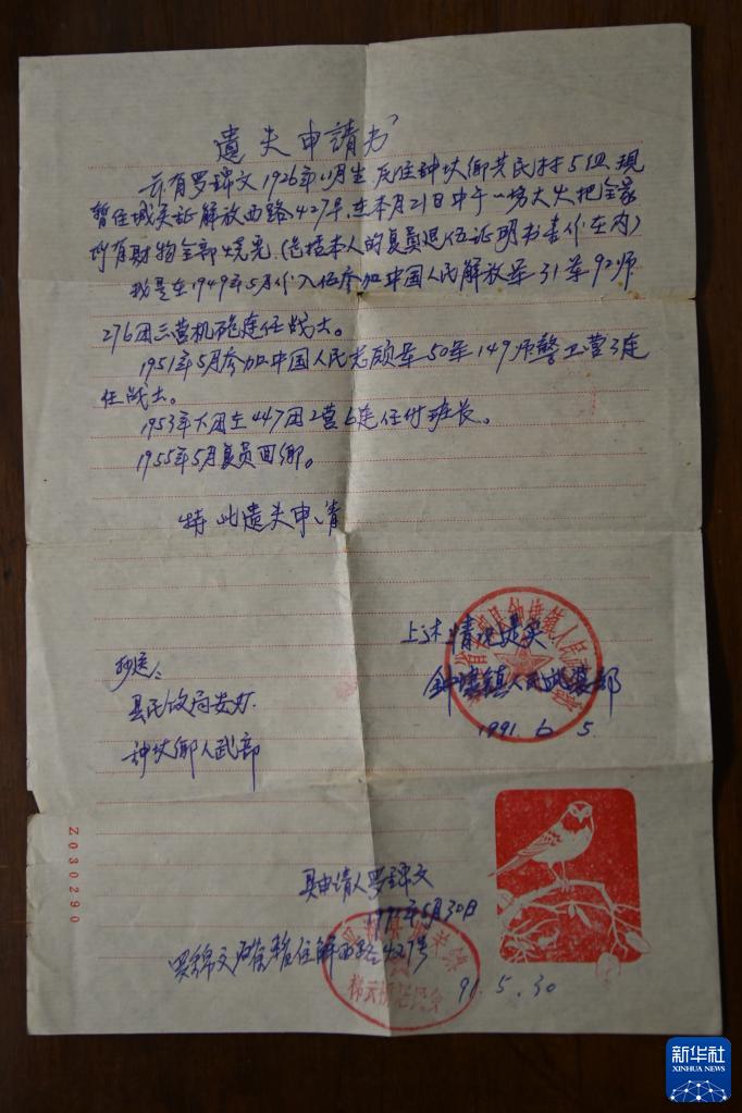罗锦文于1991年提交的“遗失申请书”(3月2日摄)。作为老复员军人,罗锦文这辈子唯一一次向政府“提要求”,是因为一场火灾。结束务农回城后,1991年出租房里的一场火灾把他“压箱底”的一枚三等功奖章及退伍证明材料等全部烧毁。于是他向当时户口所在地的钟埭镇人武部郑重提交了一份“遗失申请书”,获得了盖章认定。新华社记者 黄宗治 摄