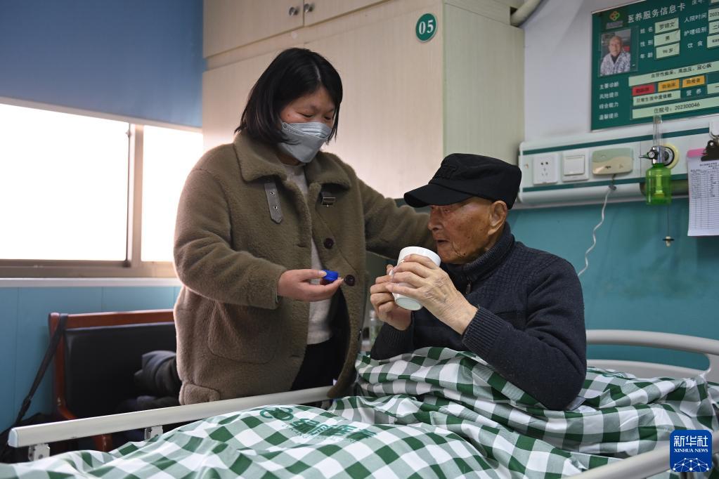 罗锦文儿媳柳燕(左)在浙江省平湖市一家老年康复护理院照顾罗锦文老人(3月2日摄)。新华社记者 黄宗治 摄