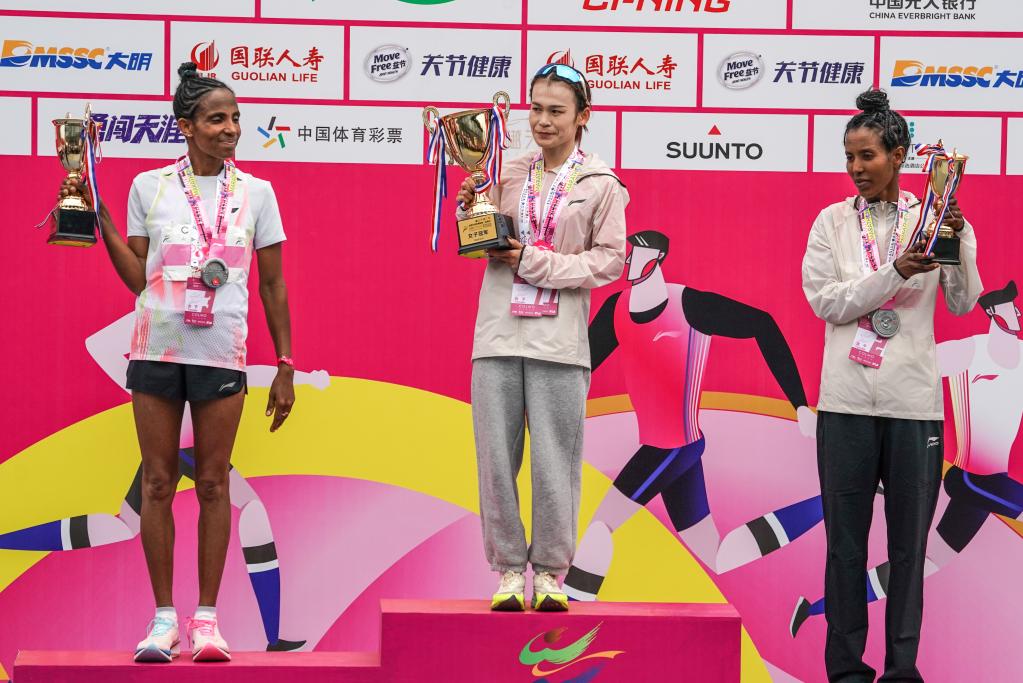 ↑3月19日,中国选手白丽(中)在领奖台上。新华社记者杨磊摄