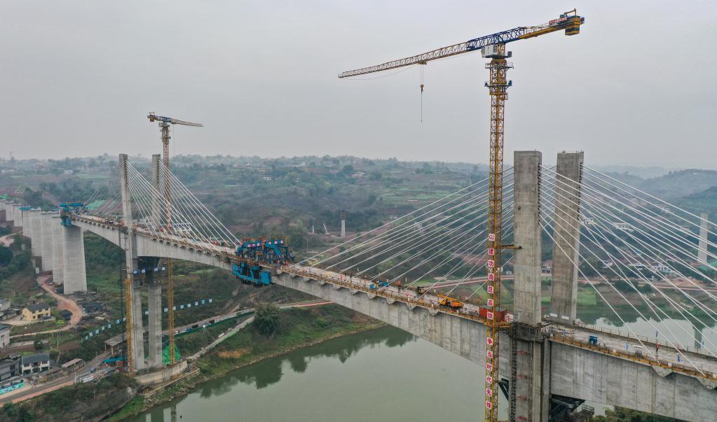 3月18日,在四川省泸州市拍摄的渝昆高铁泸州沱江特大桥主跨合龙施工现场(无人机照片)。新华社记者王曦 摄