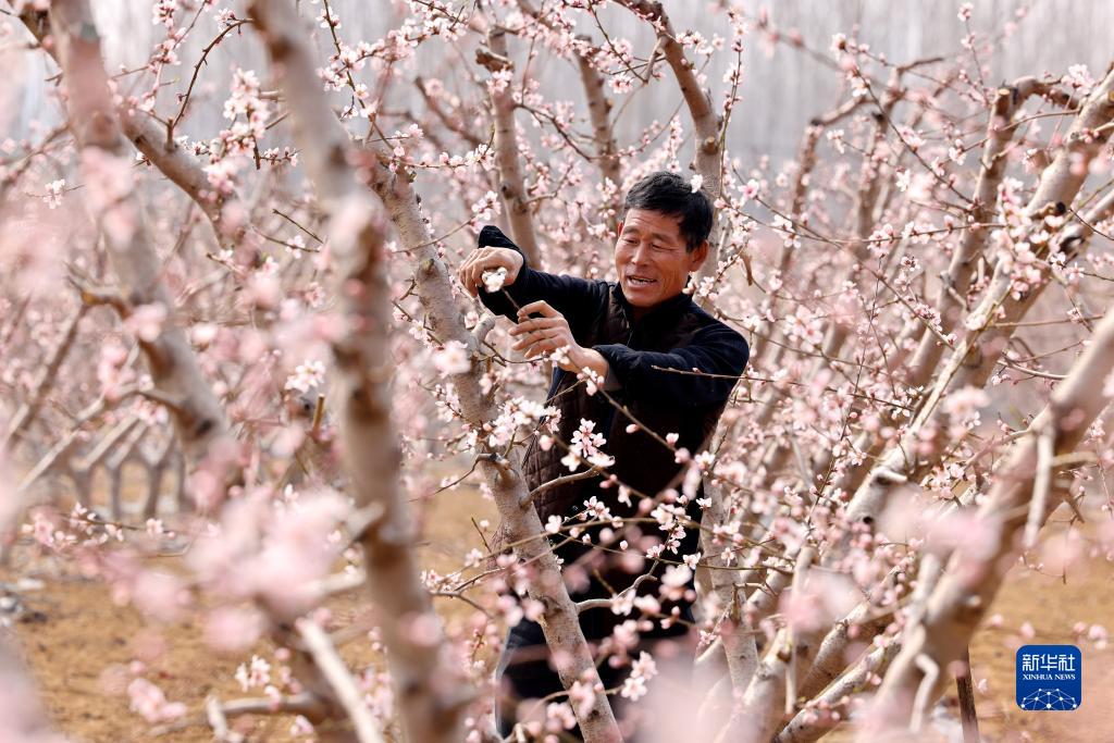 3月19日,山东省枣庄市税郭镇长汪村农民在桃园里对桃树进行春剪。