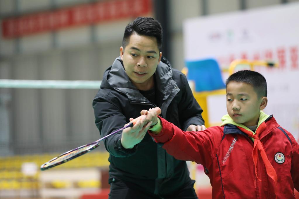 在贵州省锦屏县体育运动场羽毛球馆内,教练何剑浩指导胡必鹏握拍技术(3月7日摄)。新华社发(杨晓海摄)