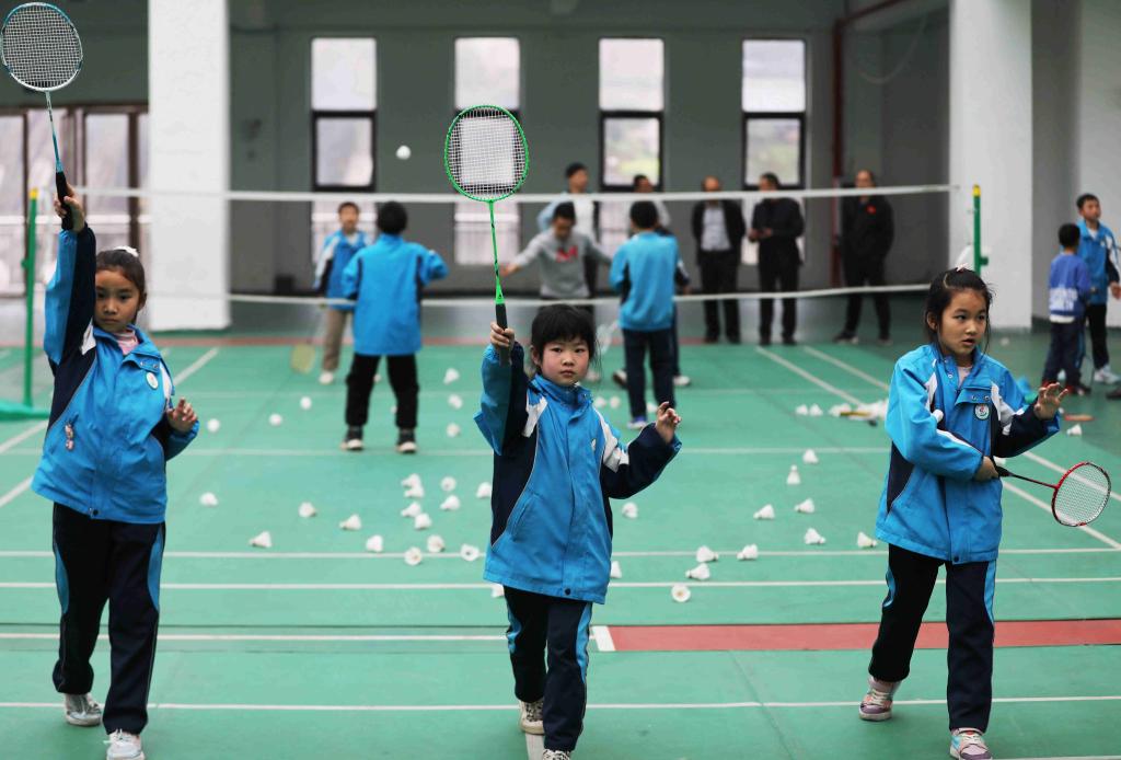 贵州省锦屏县城关第四小学学生在进行羽毛球训练(3月7日摄)。新华社发(杨晓海摄)