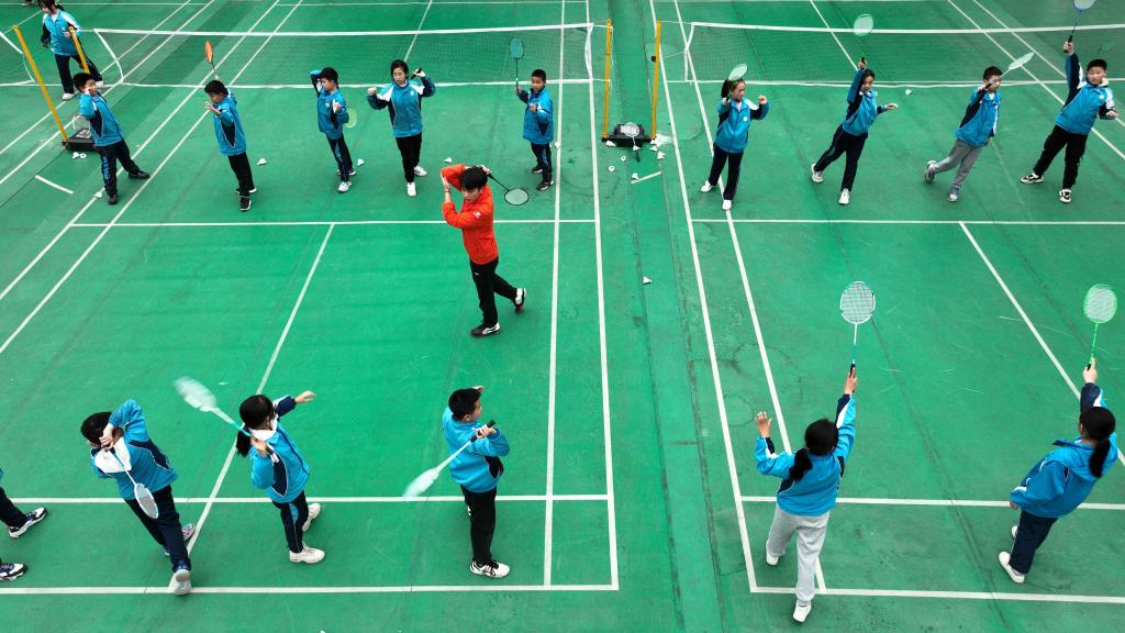 在贵州省锦屏县城关第四小学,教练员指导学生进行羽毛球训练(3月7日摄,无人机照片)。新华社发(杨晓海摄)