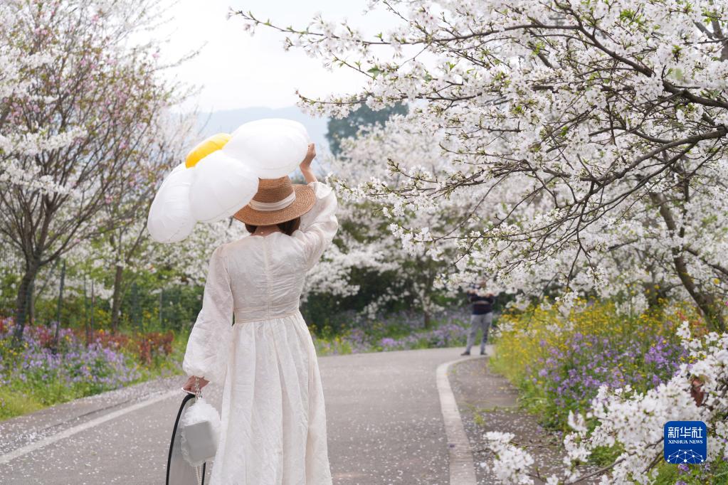 3月19日,游人在重庆市北碚区澄江镇五一村“樱花橘香”农业公园观赏樱花。