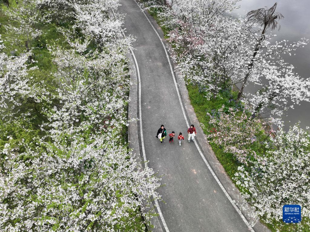 3月19日,游人在重庆市北碚区澄江镇五一村“樱花橘香”农业公园观赏樱花(无人机照片)。